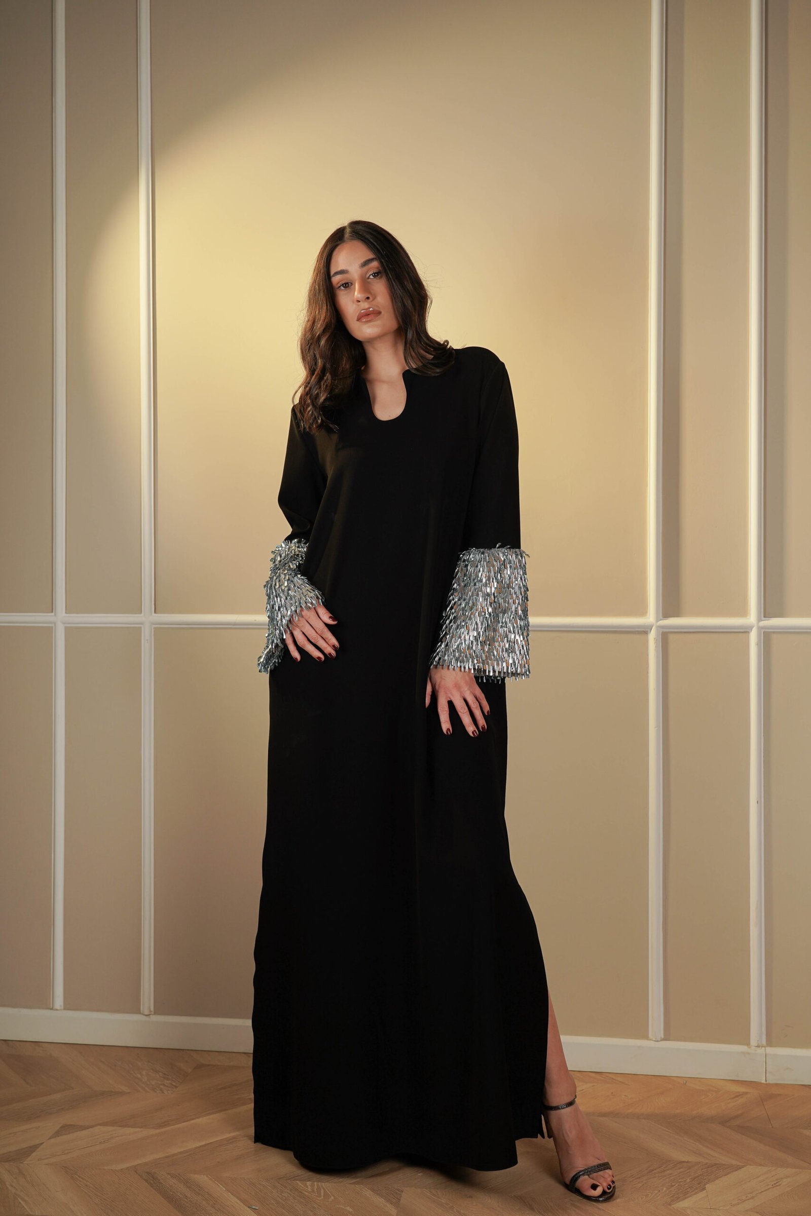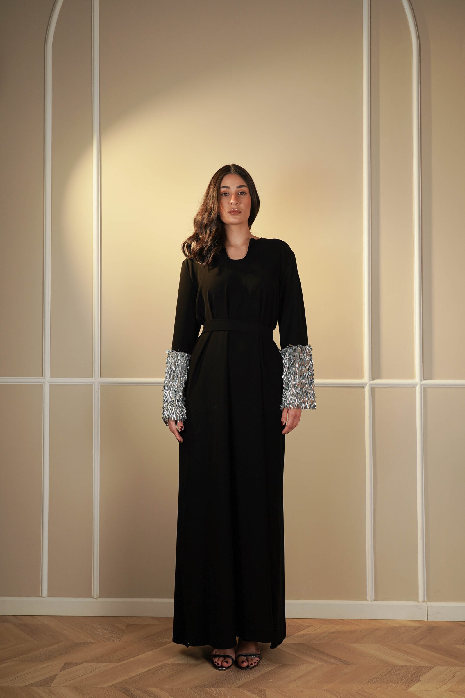 Crystal embellished trimmed crepe gown black