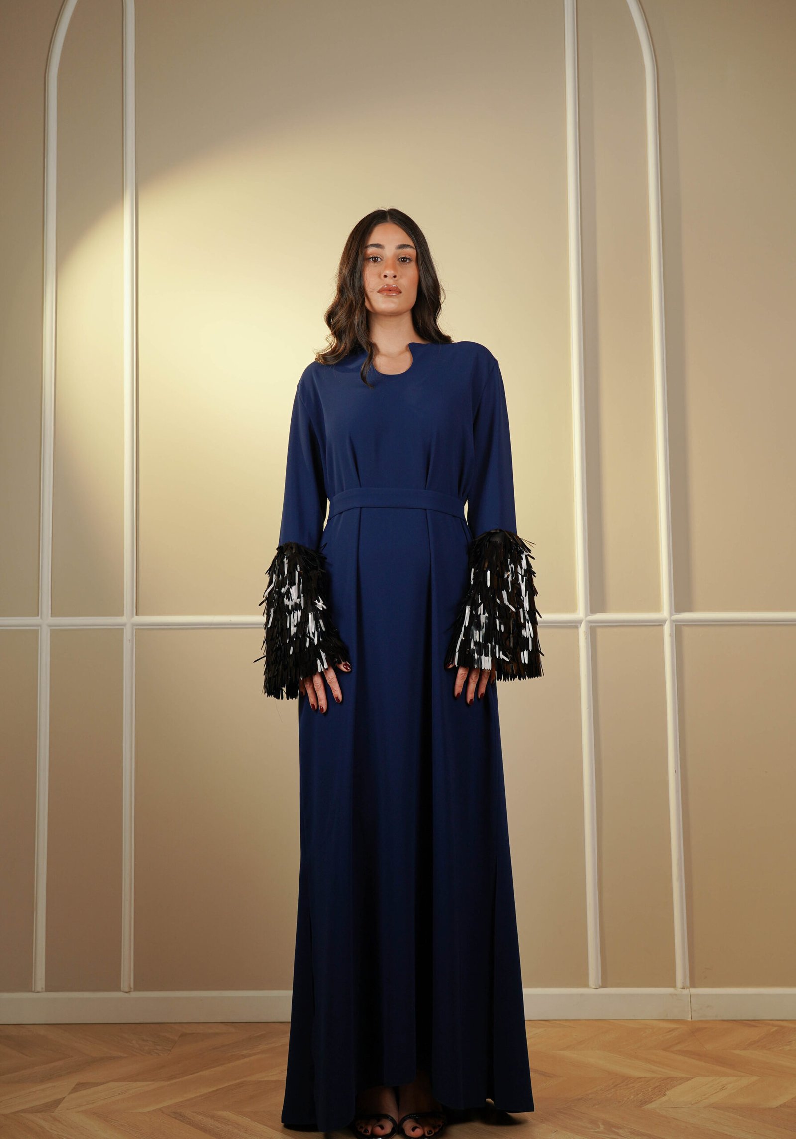 Crystal embellished trimmed crepe gown